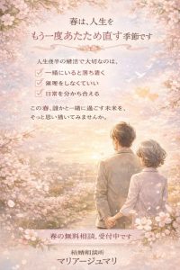 まずは、話すことからで大丈夫です。春は、心が少し緩む季節。だからこそ、誰かに気持ちを話すだけでも、次の一歩が自然と見えてくることがあります。まだ決めなくていい。でも、何も考えないままにしなくてもいい。この春、ご自身の人生について、少しだけ向き合う時間をつくってみませんか。